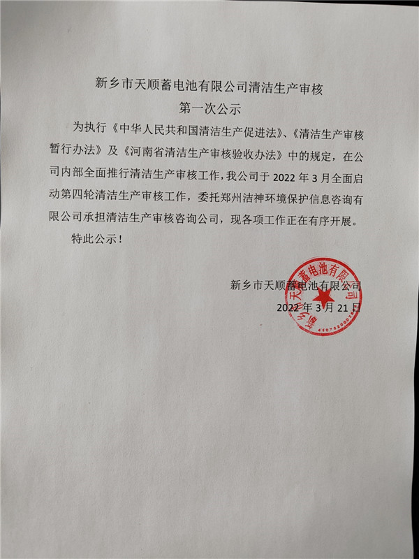 新鄉(xiāng)市天順蓄電池有限公司清潔生產(chǎn)審核公示說明