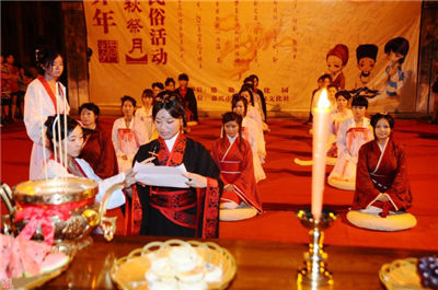 在月下,將月亮神像放在月亮的那個(gè)方向,紅燭高燃,全家人依次拜祭月亮,然后由當(dāng)家主婦切開團(tuán)圓月餅。切的人預(yù)先算好全家共有多少人,在家的,在外地的,都要算在一起,不能切多也不能切少,大小要一樣。